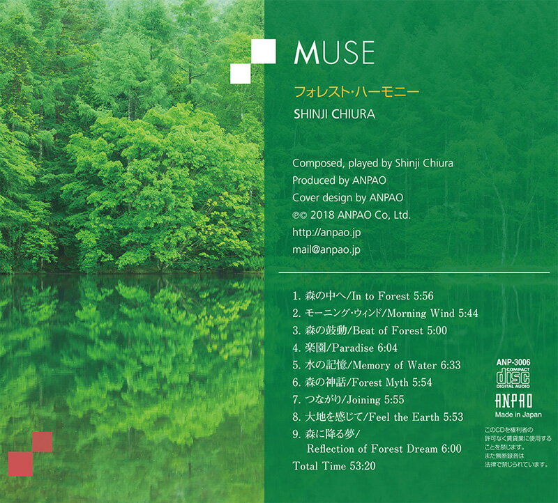 商品名 MUSE (ミューズ) フォレスト・ハーモニー [ANP-3006] 収録曲 1.森の中へ/In to Forest 5'56 2.モーニング・ウィンド/Morning Wind 5'44 3.森の鼓動/Beat of Forest 5'00 4.楽園/Paradise 6'04 5.水の記憶/Memory of Water 6'33 6.森の神話/Forest Myth 5'54 7.つながり/Joining 5'55 8.大地を感じて/Feel the Earth 5'53 9.森に降る夢/Reflection of Forest Dream 6'00 収録時間 全9曲 53:20 Music 知浦 伸司 Produced ANPAO Cover Art Work ANPAO Cover Design ANPAO