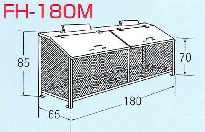 ゴミステーション ステンレス製ゴミBOX FH-180M 仕様 商品名 ゴミBOX FH-180M 容量 約863リットル(9〜12世帯程度) 製品重量 約42kg サイズ 180cm(幅) x 65cm(奥行) x 85cm(高さ) 前面の高さ:70cm 材質 ステンレス(NSSC180) 脚タイプ 固定足 ※足の床との接地面には直径12mmの穴が開いておりますので、アンカー設置ができます。
